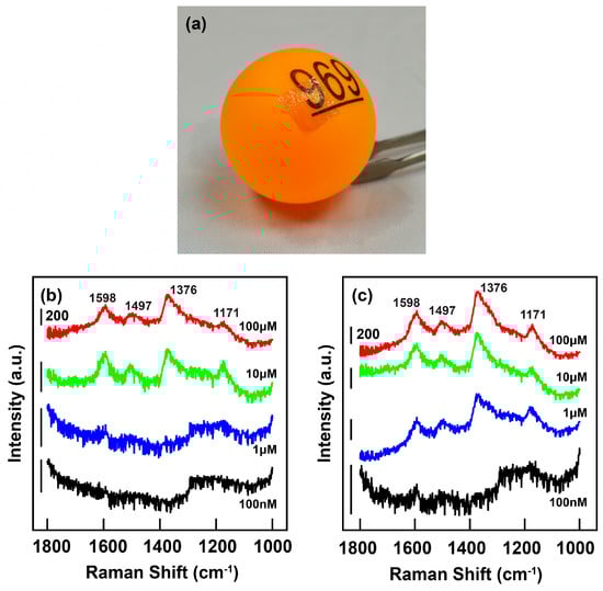 Figure 4b,c, the Raman spectra obtained from the PS film integrated with the gold nanorods are stronger than those from the blank PS film. The Raman fingerprints can be observed when the molecular concentration is as low as 100 nM.