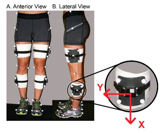 Inertial sensors were placed on the mid-lateral thighs and shanks with the Xaxis aligned superior–inferior, bilaterally. Care was taken to align the Xaxis of thigh sensors with greater trochanters and lateral epicondyles of the femur, and Xaxis of shank sensors with lateral epicondyles and lateral malleoli (Figure 1). For testing the position of inertial sensors coincided with the position of the tracking marker clusters; therefore, they were affixed to the rigid plates firmly using elastic straps and tape.