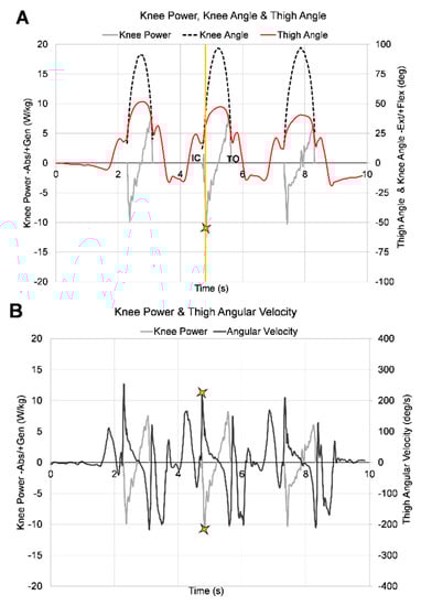 Three cycles of single limb loading task performed by one representative subject. (A) Marker-based knee angle (dashed black line), knee power (gray line), and inertial sensor thigh angle (red line); (B) Marker-based knee power (gray line) and inertial sensor thigh angular velocity (black line). Stars indicate the peak knee power absorption (A) and peak thigh angular velocity (B) identified after initial contact and before maximum knee flexion during the middle repetition of one trial.