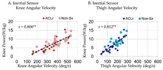 The relationship between peak knee power absorption and (A) peak knee angular velocities and (B) peak thigh angular velocities measured with inertial sensors in the reconstructed (ACLr) and nonsurgical (Non-Sx) limb; ** p < 0.001.