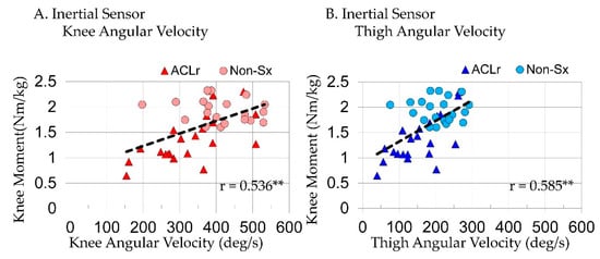 The relationship between peak knee extensor moments and (A) peak knee angular velocities and (B) peak thigh angular velocities measured with inertial sensors in the reconstructed (ACLr) and nonsurgical (Non-Sx) limb; ** p < 0.001.
