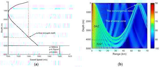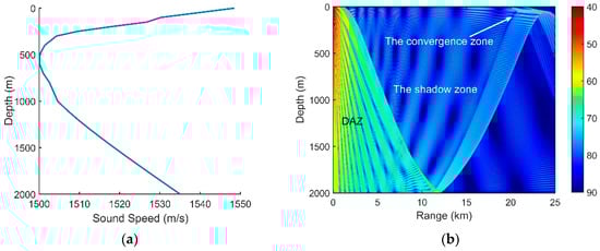The sound speed profile (SSP) presented in Figure 1a is a typical deep ocean profile. The ocean depth is 5000 m. The sound speed, density and attenuation of the basement are 1600 m/s, 1.75 g/ and 0.2 dB/, respectively. The deep sound channel (DSC) depth and surface conjugate depth were approximately 1200 m and 4050 m, respectively. Our simulation results of the transmission loss and ray structures are implemented using the BELLHOP ray tracing model. In the deep ocean, most of the targets are shallow sources. Corresponding to the parameters above, therefore, the transmission loss of the sound pressure at 150 Hz for a source at a 100-m depth is calculated by the ray model and is shown in Figure 1b. The direct-arrival zone (DAZ), the reliable acoustic path (RAP), the shadow zone and the convergence zone can be seen in Figure 1b.