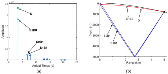 The DAZ is an important acoustic duct in the deep ocean. As shown in Figure 1b, the DAZ is always close, covering several kilometers due to the water refraction depending on the gradient of the near-surface SSP and the source depth, and in addition, its range becomes wider with the increase in the depth [1]. We consider a 16-element vertical line array with an equal spacing of 5 m. It is at a depth of 800 m. The signal source is located at a 3.1-km range and is at a depth of 100 m. The eigenray arrival structures of the first hydrophone are presented in Figure 2. Figure 2a shows clearly that the powers of the direct ray (D) and the once-surface-reflected ray (S1B0) are much larger than those of others such as the once-bottom-bounce ray (S0B1). Therefore, the multipath arrivals of the received signals in the DAZ are dominated by D and S1B0, which in fact determine the interference characteristics of the acoustic field. Other rays that undergo bottom bounces with large grazing angles can be neglected due to serious sound attenuation. As shown intuitively in Figure 1b, steady interference stripes that stem from the Lloyd-mirror effect [16] can be seen in the DAZ.