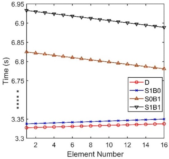 We define that the positive and negative angles represent the downward and upward acoustic rays arriving at the hydrophone, respectively. From Figure 2b, the arrival angles of D and S1B0 are approximately 12°, while the bottom reflected rays are less than −50°. Figure 3 shows the arrival times of D, S1B0, S0B1 and S1B1 in all elements. For a long range, the spherical wave from the point source moves like a plane wave, hence the four multiple waves can be viewed as plane waves respectively. The arrival times of D and S1B0 are both almost proportional to the element number, and they have almost the same deviation between two neighboring elements. The results in Figure 2b and Figure 3 indicate that the arrival angles of D and S1B0 are approximately equal and there is little difference between these two multipath waves. Therefore, D and S1B0 can be viewed approximately as two parallel plane waves if the array aperture is not large, hence their phase difference between two hydrophones will be almost same. In contrast, the signals of S0B1 and S1B1 arrive at the last element first. The cause is that their eigenrays are refracted and reflected. The equiphase surfaces of D and S0B1 are not parallel, and hence it results in signal’s phase distortion. If S0B1 and S1B1 are also significant in an acoustic field, a conventional beamformer (CBF) will aggravate the wave distortion derived from S0B1 and S1B1. While in DAZ, the acoustic signal is almost dominated by D and S1B0, and thus, the CBF that applies the proper phase shift can almost eliminate the distortion and provide a relatively high correlation between the signals of any two hydrophones.