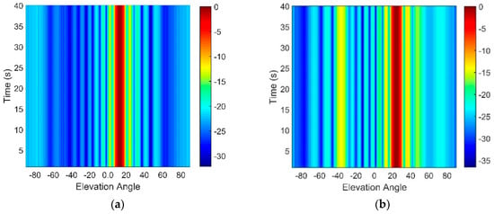 By beamforming, the beam intensity output with a 0.2° sampling interval is shown in Figure 4. In Figure 4a, the depth of the array is 800 m, and it is relatively small. There is almost no beam-splitting due to having only a small difference in the multipath arrival angles. While in Figure 3b, the array is at the depth of 3800 m, where the destructive interference between D and S1B0 appear. Other than D and S1B0, S0B1 also contributes to the sound field here. A splitting with two elevation angles can be observed at this depth due to multipath propagation, and it causes a lower beamforming rate.