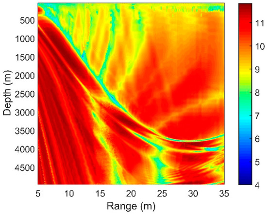 Similarly, when the source with a depth of 10 m was located at the horizontal range of 4.0 km, we present the vertical structures of the signal and noise in Figure 24 and Figure 25, respectively.
