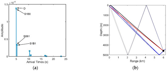 (a) Arrival times and amplitudes of the eigenrays and (b) Propagation paths of the eigenrays.