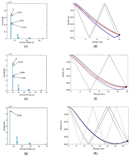The arrival structures of the eigenrays from a 100-m deep source to the hydrophone at a depth of 4550 m in a range-independent ocean are shown in Figure 7. Four horizontal ranges of the source are assumed to be 6, 20, 30, and 38 km, respectively. Other acoustic parameters are the same as those in Figure 1a. The rays that penetrate into the bottom are neglected, and thus, the acoustic properties of the half-space are chosen to simulate the sediment layer in the deep ocean. The frequency for the simulation is 150 Hz. At the range of 6 km, only D and S1B0 are significant. At this range, rays penetrate into the bottom with large grazing angles, and thus, major energy is attenuated in the substrate [17]. When the source is fixed at 20 km in the range, in addition to D and S1B0, the S0B1 and S1B1 become significant. As the rays penetrate into the bottom with smaller grazing angles, more energy is reflected into the water. Therefore, the SG declines to approximately 7–8 dB when the source is located at 19–25 km because there is a relatively large difference in the multipath arrival angles between two groups of multipath signals (“D, S1B0” and “S0B1, S1B1”) with almost the same amount of energy. B1S0 is weak in this range due to the large grazing angle on the bottom and the additional geometric attenuation. For the source at 30 km, two new types of rays become significant. D, S0B1, and S1B1 are strongly bent, which indicates that they are close to being cut off by the gradient of the SSP. From Figure 7f, the D, S0B1 and S1B1 are bent to approximately in such a way that the arrival angles of these rays are approximately the same. The waveform distortion between pairs of hydrophones become small due to having only a small difference in the multiple arrival structures, and hence, a relatively high SG can be achieved through CBF. According to the definition of the RAP introduced in Section 2.2, this source range is close to the edge of the RAP. At the source range of 38 km, the three types of rays are cut off, and the S1B0 exhibits strong bending; hence, this range is so long that it exceeds the region of the RAP.