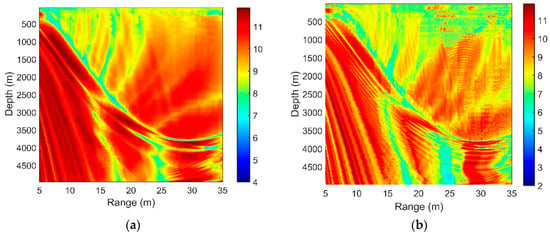 Figure 8a,b show the SG in different source frequencies. The source depths are both 100 m, and the separation of the hydrophones is . We can see that as the source frequency increases, the interference striations are closer. With increasing acoustic frequency, the SG declines moderately.