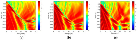 The spatial gain distribution is significant in designing sonar equipment and determining the performance and deployment of the array. According to Section 3.3, the spatial gain obtained through CBF can be traced to the correlation coefficients of the signals and noise associated with the signals. We consider a deep ocean with the same acoustic parameters in Figure 1a. The target is at the depth of 100 m, radiating a sweeping frequency signal with the central frequency of 100 Hz and a bandwidth of 50 Hz. The vertical line array has an equal spacing of 15 m () and contains 16 elements. By using BELLHOP model, we can generate a two-dimensional mesh in which the received signal of every point can be simulated based on ray theory, and then the SG of every point can be calculated according to Equation (19). Figure 6 shows the SG with different array locations.