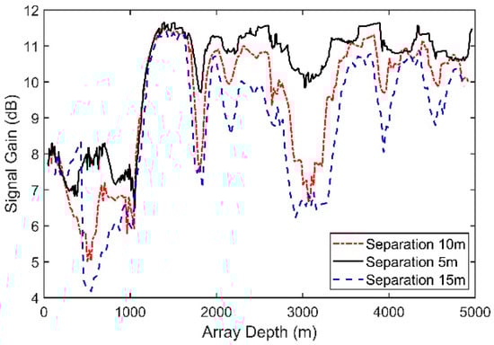 Figure 10 presents the SG for arrays with different separations of neighboring hydrophones. The vertical line array contains 16 elements, and the source radiates a 150-Hz signal with a depth of 100 m and a range of 10 km. With an increase in the element separation, the SG declines moderately. This trend occurs mainly because a high ratio of the element separation to the wavelength will lead to a greater difference between the multipath structures in different hydrophones.