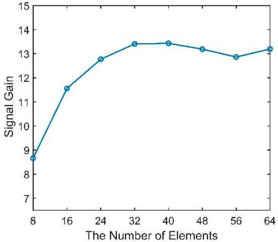 Figure 11 shows the variation in the SG with increasing numbers of hydrophones. Unlike the SG, which will increase logarithmically as the number of elements increases in a horizontal array, after increasing to a certain level, the SG here grows slowly and even begins to decrease. Similarly, this trend occurs mainly because a larger array aperture will lead to a greater difference between the multiple structures in the different hydrophones and, hence, to a lower coherence between signals. Therefore, simply increasing the number of elements in the vertical array has little effect.