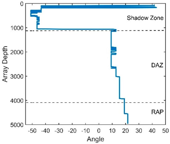 We define the arrival angles that correspond to the maximum angular response of the CBF as the vertical directionality of the acoustic signal. The 100 m-deep source is fixed in the range of 10 km, radiating a sweeping frequency signal with a center frequency of 150 Hz and a bandwidth of 50 Hz. The vertical array contains 16 elements with an equal spacing of 5 m, and the other parameters stay unchanged. The vertical directionality of the signals with different array depths is shown in Figure 12. It can be seen that from the top of the DAZ to the base of the RAP, the elevation angles keep increasing and almost equal the arrival angle of D. As illustrated above, under this source range, the received signals in the DAZ and RAP are dominated by D and S1B0. The direction of the acoustic signal in the shadow zone varies almost without a law because of its unstable multipath arrivals.