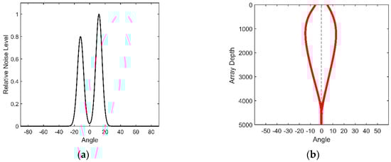 The directional density of the shipping noise versus the depth has been generated in [14], as shown in Figure 13b. This figure shows that the directional density depends on the depth. The black line in Figure 13b means the horizontal direction. This type of dual-homed phenomenon can be explained by ray theory. Both of the upgoing and downgoing rays exist at the receiver’s station, and these two types of rays are symmetric about the horizontal. According to Snell’s law, acoustic rays bend to the depth where the sound has the lower speed. Therefore, the notch has the maximum width at the DSC depth. When reaching the surface conjugate depth, the rays start to reverse, and the angles of the rays versus the horizontal approach 0° gradually; thus, the notch disappears below the conjugate depth.