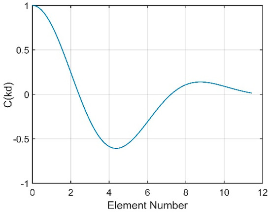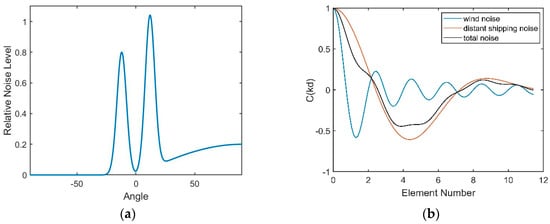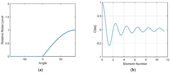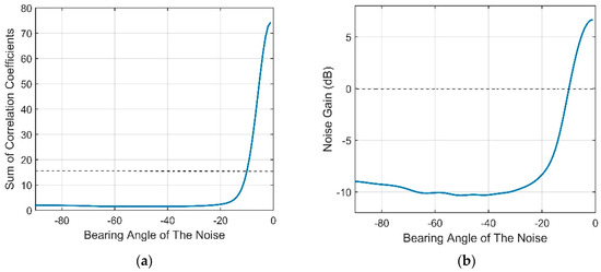 According to Equation (20), the NG is related to the sum of the correlation coefficients between the noise contributions of all pairs of hydrophones. Figure 15a presents the sum versus various values of . The decrease in implies that the interval between the two peaks decreases. When decreases to almost 0°, the noise will be incident on the vertical array from directions closer to the horizontal, which is the array’s natural steering angle. Seen from Figure 15a, the coherence radius is farther from the origin when decreases. This finding illustrates that the closer the steering angle of array is to the direction of the noise, the larger the coherence radius will be. Consequently, the correlation coefficients of all pairs of hydrophones will be higher, which ultimately causes a higher NG. The variation in the NG with is presented in Figure 15b. When decreases to 0°, which is the natural steering angle of the array, the NG will reach 6.7 dB. In contrast, a negative NG, which could enhance the array gain, can be achieved when the array’s steering angle is far away from the direction of the noise. This finding shows that the NG will be positive if the steering angle of the CBF is within approximately ±10° of the noise direction.