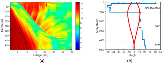 First, the source with a depth of 50 m was located at the horizontal range of 2.4 km. Figure 20b is the transmission loss. The array was located in the DAZ, and thus, the received signal was mainly composed of D and S1B0.