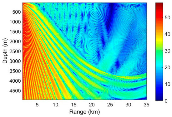 Figure 9a–c present the SG with the source depths of 50 m, 100 m and 200 m, respectively. According to the Lloyd-mirror interference pattern [16], by simplifying, the received pressure of the sensor can be written as