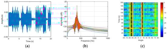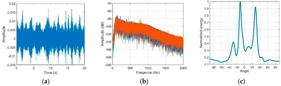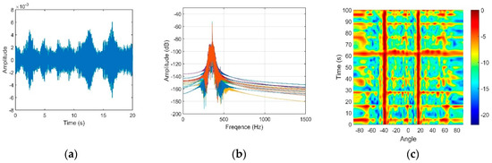 (a) Noise waveform; (b) Noise frequency through the 100 Hz to 1 kHz bandpass filter; (c) Directionality of the noise.