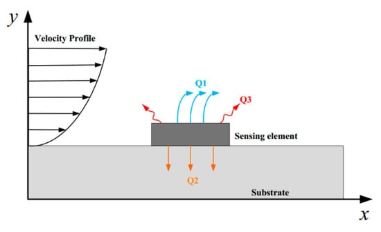Basically, a hot-film sensor makes use of the principle of heat transfer from a thermistor heated by current to the passing flow []. As shown in Figure 1, the heat generated by the thermistor dissipated into the ambient in three ways, heat convection to the flow (Q1), heat conduction to the substrate (Q2), and heat radiation (Q3), while the heat radiation can be neglected. The rate of heat loss from the heated thermistor to the flow is dependent on the velocity profile in the boundary layer. The wall shear stress τw generated by the flow is expressed as [],
