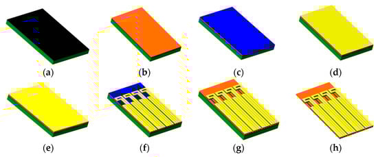 The fabrication processes of the flexible hot-film sensor array are shown in Figure 2 []. A ready-made polyimide (PI) foil in the thickness of 50 μm is used as the sensor substrate. It is affixed onto a glass wafer by using a polydimethylsiloxane (PDMS) adhesive layer (b), which is spun-on the wafer. Thermal sensing nickel (Ni) layer of 1 μm is then magnetron sputtered (c) onto the cleaned PI foil. With a 200 nm thick sputtered copper seed layer (d), the copper tracks layer is electroplated (e) to 2 μm. Then a first photolithography step is carried out and the tracks are wet-etched (f). Afterwards, the sensing elements are patterned with a second photolithography and wet-etched processes (g). The sensing element is 3 mm long and 50 μm wide. Finally, the sensor array is released from the glass (h). The fabricated sensor array with eight sensors is shown in Figure 3.