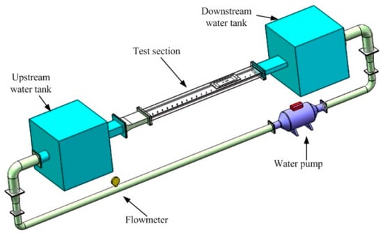 The sensor array calibration was carried out in a water tunnel. The schematic drawing of the water tunnel facility is shown in Figure 4, it mainly consists of upstream and downstream water tanks, water pump, electromagnetic flowmeter, and test section. The test section channel has a length of 2600 mm, a width of 250 mm, and a height of 20 mm. The wall shear-stress in the channel is obtained from the measurement of the pressure gradient along its length. As illustrated in Figure 5, there are 23 pressure taps that are distributed uniformly at the lower wall of the test section. The first tap is 75 mm from the inlet of the test section, and the distance between every two neighboring taps is 100 mm. The shear stress can be calculated by the following equation,