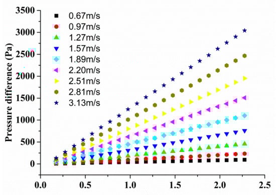 In the calibration experimental setup, the sensors were surface-flush mounted on the center line of the upper wall of the test section (Figure 5). The eight sensors in the array were located from 1654 mm (sensor 1) to 1696 mm (sensor 8) from the inlet of the test section, and the space between two neighboring sensors is 6mm. These distances from the inlet of the test section to the sensors are sufficient to ensure that the flow is fully developed and effectively two-dimensional [,]. The hot-film sensors were working under CC mode, and the driving current were 50 mA. The steady-state sensor output voltages were measured by a data acquisition system (National Instruments) with a sampling frequency of 12 kHz for 8 s. The water temperature was 16 °C and unchanged during the calibration. The pressure difference with various velocities is shown in Figure 6.