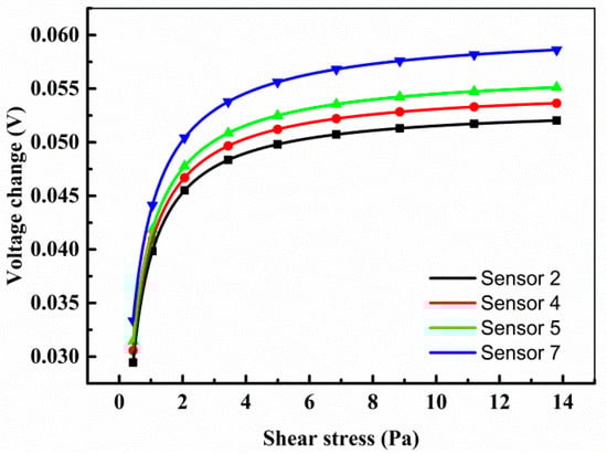 The calibration curves of sensor 2, sensor 4, sensor 5, and sensor 7 are shown in Figure 7, respectively. According to Equation (10), the relationship between voltage change ΔU (V) and shear stress τw (Pa) can be expressed by the following equations,