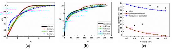 Meanwhile, the velocity profile at where sensor 5 located (x = 804 mm) were obtained by the DANTEC Flow Explorer LDV system, its uncertainty of velocity measurement is about 0.06%. An adequate near-wall resolution in the measurements is essential for an accurate interpretation of the results []. The velocity profiles compares with laminar Blasius [] and turbulent Spalding []; velocity profiles are shown in Figure 10a,b, respectively. Hence, the shear stress can be obtained according to Equation (1). On the basis of boundary layer thickness definition [], we can also get the boundary layer thickness according to the velocity profiles. The boundary layer thickness and shear stress that were calculated by the velocity profiles are shown in Table 4.