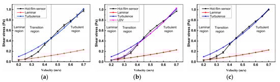 The shear stress and its error [] measured by the hot-film sensors compared with empirical formulas and LDV results were shown in Figure 11. We can see that the shear stress measured by the hot-film sensors are almost equal to the laminar empirical formulas values when the flow is laminar and basically same with the turbulence empirical formulas values when the flow is turbulence. From Figure 11b, we can see that the shear stress measured by sensor 5 (x = 804 mm) are all same with the LDV results no matter in laminar, transition, and turbulent regions. The measuring errors of the hot-film sensors are less than 5%.