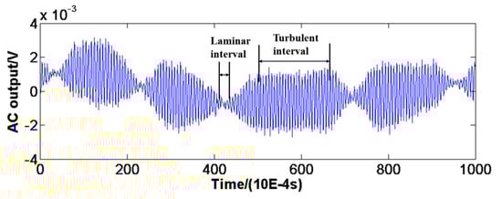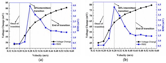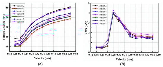 The voltage changes and RMS of all seven sensors in the array are shown in Figure 13a,b, respectively. The variation tendency of other five sensors are same with sensor 2 and sensor 8. The voltage changes and RMS both have an abrupt increase at U = 0.2 m/s. The RMS reach a local maximum value at U = 0.28 m/s, then dropped sharply until U = 0.44 m/s. When velocity is greater than 0.44 m/s, the RMS reach a stable value which is greater than laminar flow and less than 50% intermittent transition.