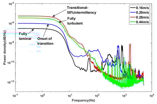 A waterfall plot of the spectra (Figure 15) from the voltage-time traces of sensor 2 at different velocities indicate the characteristic shapes of laminar, transitional, and fully turbulent boundary layers. Welch’s power spectral density estimate method was employed to analyze the spectra of the output voltage signals, window is 2048 and noverlap is 1024. The source for the peak in energy at about 50 Hz that is present at U = 0.16 m/s is believed to be associated with power frequency interference, which is easy to be seen in laminar boundary layer spectra. The spectra of the low velocity (U = 0.16 m/s) shows a significantly low energy level, which is usually associated with a laminar boundary layer. The spectra at U = 0.20 m/s indicates the beginning of the transition and shows a marked increase in energy when compared to the lower velocities. The spectra at U = 0.28 m/s shows a surge in energy across the spectrum, which is associated with the 50% intermittency transitional boundary layer. The spectra for the fully turbulent boundary layer (U = 0.44 m/s) have a litter lower energy level than the 50% intermittency signal, but the energy is higher than the fully laminar and the onset of transition.