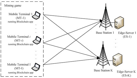 Thanks to its advantage, MEC has been exploited in many different paradigms, e.g., green IoT and vehicular networks [24,25,26]. In the following, we mainly review the studies about the resource management for MEC. Focusing on the single user’s binary task-offloading, Melendez et al. proposed the offloading decisions for reducing the completion time [27]. Further taking into account the radio resource utilization in MEC, many studies have been devoted for the joint optimization of task offloading and radio resource allocation [28,29,30]. Optimal offloading strategies for partial computation offloading (in which the MTs are allowed to offload partial of their computational workloads) have been investigated in [31,32]. The scenario of multi-user MEC is close to our study here. Focusing on minimizing the delay in completing the computation tasks, there have been many studies investigating the proper multi-user computational resource allocation [33,34]. In [35], a multi-user computational resource allocation (i.e., the CPU cycle) scheme has been proposed to save the users’ energy consumption. In [36], Jin et al. proposed an auction-based scheme for sharing the computational resource at the mobile edge. In [37], a revenue-maximization oriented computational resource allocation scheme has been proposed. In particular, some recent work investigated the exploitation of MEC for Blockchain. In [22], Xiong et al. exploited the MEC for Blockchain and investigated the resource management and pricing strategy. In particular, the paper formulated a two-stage Stackelberg game to maximize the profit of the edge service provider and the utilities of the miners. In [23], Liu et al. studied the computation offloading and content caching in wireless Blockchain networks with MEC. In particular, the economics based mechanisms have been envisioned as the promising approaches for enabling efficient yet distributed resource allocations in wired or wireless networks [38,39,40], in which the pricing mechanism and game theoretic modelling have been widely exploited. For instance, in [41], Ha et al. proposed time dependent pricing scheme for mobile data management. In [42], Tsiropoulou et al. proposed a novel joint customized price and power control for optimizing the energy-efficiency in multi-service wireless networks. In recent work [43], by taking into account the competitive wireless Internet service market, Vamvakas et al. proposed an efficient pricing strategy for the joint dynamic provider selection and the associated power allocation. In this work, we exploit the mechanism of the dual price (which is also referred as the shadow price) to achieve an efficient allocation of the edge servers’ computational resources to different mobile users/miners.