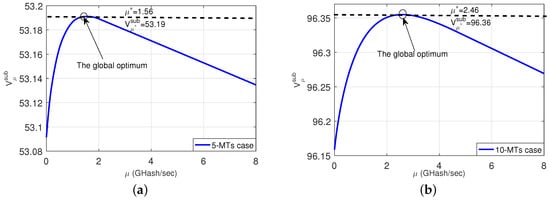 The use of the above can be explained as follows. After solving the proof-of-work puzzle, MT i needs to broadcast its result to other MTs for reaching the consensus. Since the broadcasting of the computation-result among the MTs suffers from a certain delay, it is possible that MT i fails to be the first one whose computation-result reaches the consensus among all MTs (even though that MT i is the first one who solves the proof-of-work puzzle). The orphaning probability in (4) quantifies such a probability. In particular, the same as [22,44], we express as the Poisson distribution with parameter , in which parameter denotes the inter-arrival rate of the Poisson distribution. Based on (3), we can express MT i’s net-reward function in winning the mining game as follows: