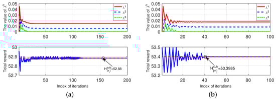 Figure 5 shows the convergence of our Algorithm 6 for solving Top-problem (TRO-top). The left-subplot shows the case of 5-MT and 3-ES (which is used in Figure 4 before), and the right-subplot shows the case of 10-MT and 3-ES. The results show that our algorithm can quickly converge to the optimal solution (i.e., ) and reach the global optimum of the total net-reward of all MTs.