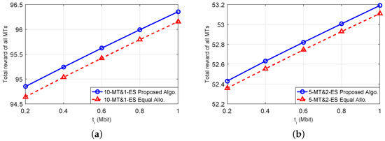 Figure 3 evaluates the impact of the ES’s price for providing the computational power to the MTs. When the price increases, the MTs become conservative in using the computational power from the ES, and thus the total computational power acquired from ES 1 decreases (as shown in the right subplot). Accordingly, all MTs’ total net-reward gradually decreases when the price increases (as shown in the left subplot).