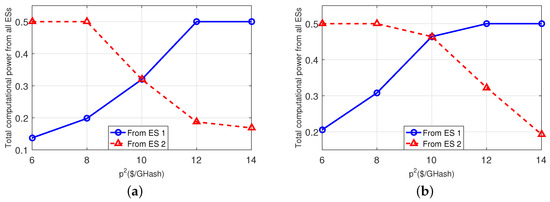 Finally, in Figure 7, we evaluate the impact of the ESs’ prices for providing the computational power to the MTs. We use the same parameter-settings as Table 3, but fix $/GHash and vary from 6 $/GHash to 14 $/GHash. Both subplots show that all MTs’ totally acquired computational power from ES-2 gradually decreases due to the increasing price. As a result, the MTs are encouraged to acquire more computational power from ES-1.
