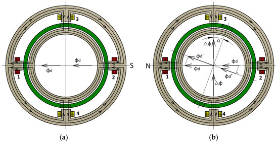 Instantaneous magnetic flux distribution: (a) magnetic flux distribution in the null position; (b) magnetic flux distribution when the rotor moves clockwise by an angle of away from the null position.