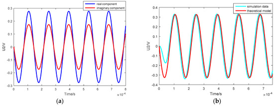 The result of the real and imaginary components obtained by numerical calculation is shown in Figure 5a, and the curves of the output voltage for the simulation and theoretical models are contrasted in Figure 5b. The fact that the stable curves overlap identically confirms the validity of the theoretical model.