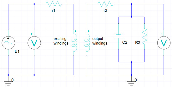 where is the magnetic flux density, is the magnetic field intensity, is the electric field density and is the conductivity of the material. First, the magnetic vector potential () is introduced for simplified calculation. After substitution, by merger and normalization, the discrete equation of all internal nodes in the computational domain can be deduced. Then, the magnetic flux density at each time step at every node in the finite element model is obtained. Finally, by importing the electrical circuits connected with the windings shown in Figure 6, the variation curves of the output voltage in the output windings can be obtained.