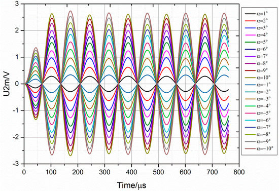 When the rotor rotates clockwise or counterclockwise away from the zero position, the angle of rotation value is defined as positive or negative, respectively. Figure 7 shows the curves for the variation of the output voltage with time when the angle of rotation of the rotor is ±1°, ±2°, ±3°, ±4°, ±5°, ±6°, ±7°, ±8°, ±9° and ±10°. The output voltage amplitude increases with the angle of rotation; however, this trend gradually weakens. In addition, the phases of the curves of the same direction of rotation as the rotor are identical, and the phase difference between the positive angle and negative angle is 180°. Moreover, after a transient period of approximately 300 μs, the stable shape of curves is a standard sine wave. The transient period of approximately 300 μs can be ignored in real engineering applications; hence, we can conclude that the small-angle transducer has a very fast response.