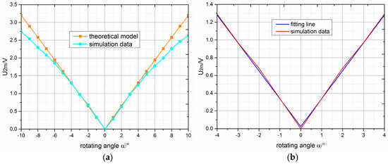 (a) Variation of output voltage amplitude with angle of rotation in the theoretical model and simulation; (b) linear fitting of simulation data within ±4°.