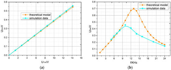 Variation of output voltage amplitude with excitation voltage frequency and amplitude in the theoretical model and simulation; α = 1°: (a) excitation voltage amplitude; (b) excitation voltage frequency.