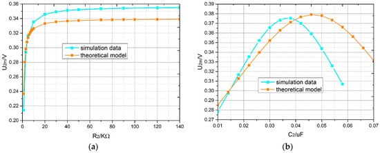 Variation of the output voltage amplitude with the capacitance and resistance of load in the theoretical model and simulation; α = 1°: (a) the resistance of load; (b) the capacitance of load.