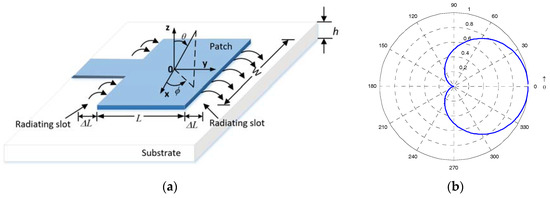 Schematic diagram (a) and radiation pattern (b) of the rectangular microstrip antenna.