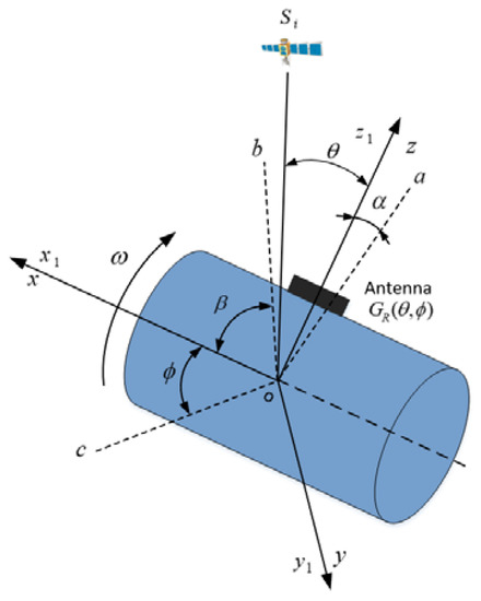 As shown in Figure 2, the antenna, denoted by a black rectangle, is mounted on the surface of a cylindrical vehicle, and the body frame of the vehicle is defined as ox1y1z1, ox1 along the spinning axis, oy1 pointing to the phase center of the antenna, and oz1 completing the right-handed reference frame. The spherical radiation coordinate system of the antenna is defined as oxyz, which shares the same origin and axes with body frame ox1y1z1. The only difference between the antenna coordinate system in Figure 1 and Figure 2 is that the origin of the coordinate system in Figure 2 is at the center of the vehicle, not the center of the antenna. However, θ in Figure 2 can be approximately equal to the azimuth angle θ in Figure 1, because the diameter of the vehicle is short enough to be ignored, as compared to the distance between the vehicle and the satellite, while φ in Figure 1 and Figure 2, it is totally the same. So, the radiation pattern of the antenna can still be represented by (1) and (2) with angles (θ,φ) in Figure 2.