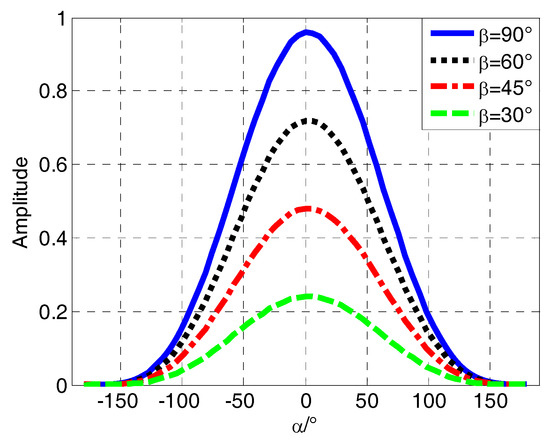 As we can see from Figure 2, the i-th satellite is denoted by Si. The oa, ob and oc are the projections of the satellite’s line-of-sight (LOS) vector on y1oz1, x1oz1, and x1oy1 surfaces, respectively. α is the roll angle in surface y1oz1 and β is the elevation angle in surface x1oz1. When the vehicle rotates in the air, α changes periodically from 0 to 360 degrees. To facilitate analysis of the spinning vehicle, (θ,φ) is replaced by (α,β). Figure 3 shows the variation of normalized amplitude received by a rotating antenna at different angles of β.