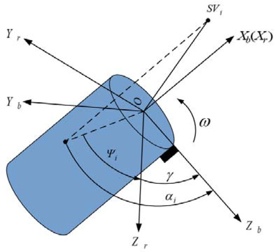 The body frame spins with the vehicle, while the reference coordinate system is rigidly attached to the spin axis, but not the rest of the vehicle body. The roll angle γ is between the OZb and OZr axis. αi is the angle between OZb axis and the projection of LOS on the OYiZi surface, which is the phase we are going to obtain from the roll modulation signals.