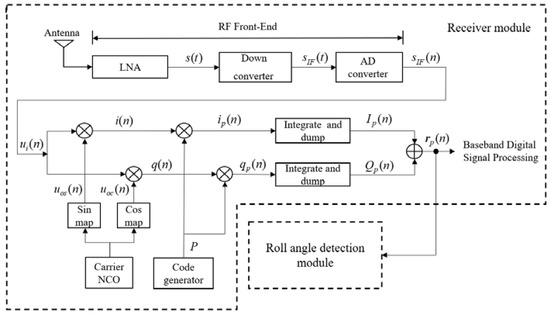 Figure 5 shows the block diagram of a GPS receiver with a roll angle detection module. In a receiver, the power of the i-th satellite’s signal is centralized in the correlation results Ip(n) and Qp(n) after processed by RF (Radio Frequency) front-end and baseband processing [22]. The correlation results of the i-th satellite’s signals can be represented by: