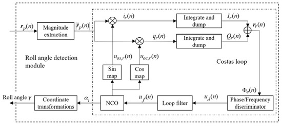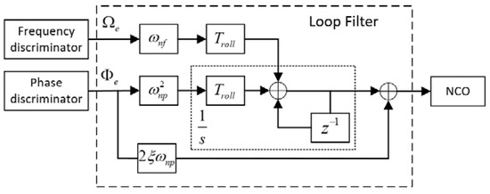 Figure 9 shows a block diagram of the proposed roll angle detection module. The FLL-assisted PLL based Costas loop contributes the most to the module. FLL-assisted PLL combines the advantages of both tracking loops, which means it can track the phases of input signals precisely under high dynamic stress [24]. A second-order PLL with first-order FLL assisted filter is selected, because both loops are insensitive to constant velocity, while the roll angle measurements here focus on a constant rotational speed with tiny signal dynamic stress to the roll modulation signals. The loop filter is as shown in Figure 10, and there are four parameters that need to be determined. They are damping ratio ξ, the natural frequency of PLL ωnp, the natural frequency of FLL ωnf, and the integration time Troll. Ωe is the frequency error, and Φe is the phase error between the roll modulation signals and local replicas.