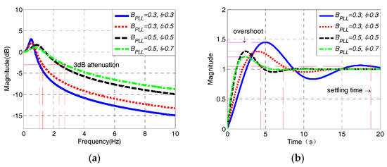As seen from Figure 12a,b, the damping ratio ξ and noise bandwidth BPLL both determine the cut-off, settling the time and overshoot characteristics of PLL. The larger the damping ratio and the noise bandwidth is, the smaller the settling time and overshoot would be, and the cut-off frequency of PLL could also be increased, leading to a reduction of tracking accuracy. While the frequency of the input signal is between 3 to 300 Hz, the 3 dB attenuation frequency of PLL has to be less than 3 Hz to guarantee the filtering performance when the PLL is used to track the input signals with minimum frequency. In that case, the parameters of PLL must be BPLL ≤ 0.5 Hz, ξ ≤ 0.7.